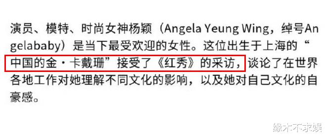 采訪中,Angelababy被外媒稱為演員、模特、時(shí)尚女神,出生于上海的“中國的金.卡戴珊”,對其評價(jià)很高。